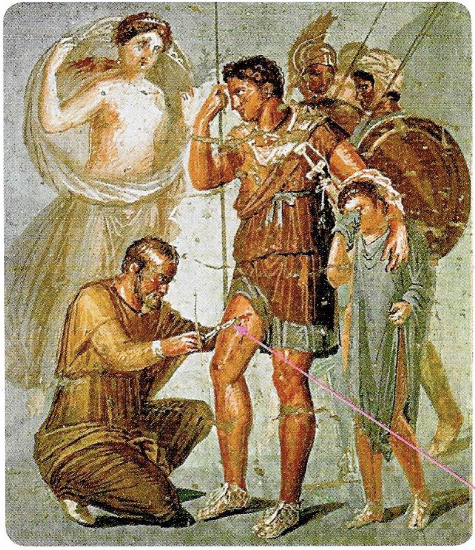 Il y a très peu de représentations de médecins dans l’exercice de leurs fonctions : on n’en trouve que lorsque le patient est un héros mythologique, comme sur la fameuse fresque du musée de Naples représentant Énée blessé.