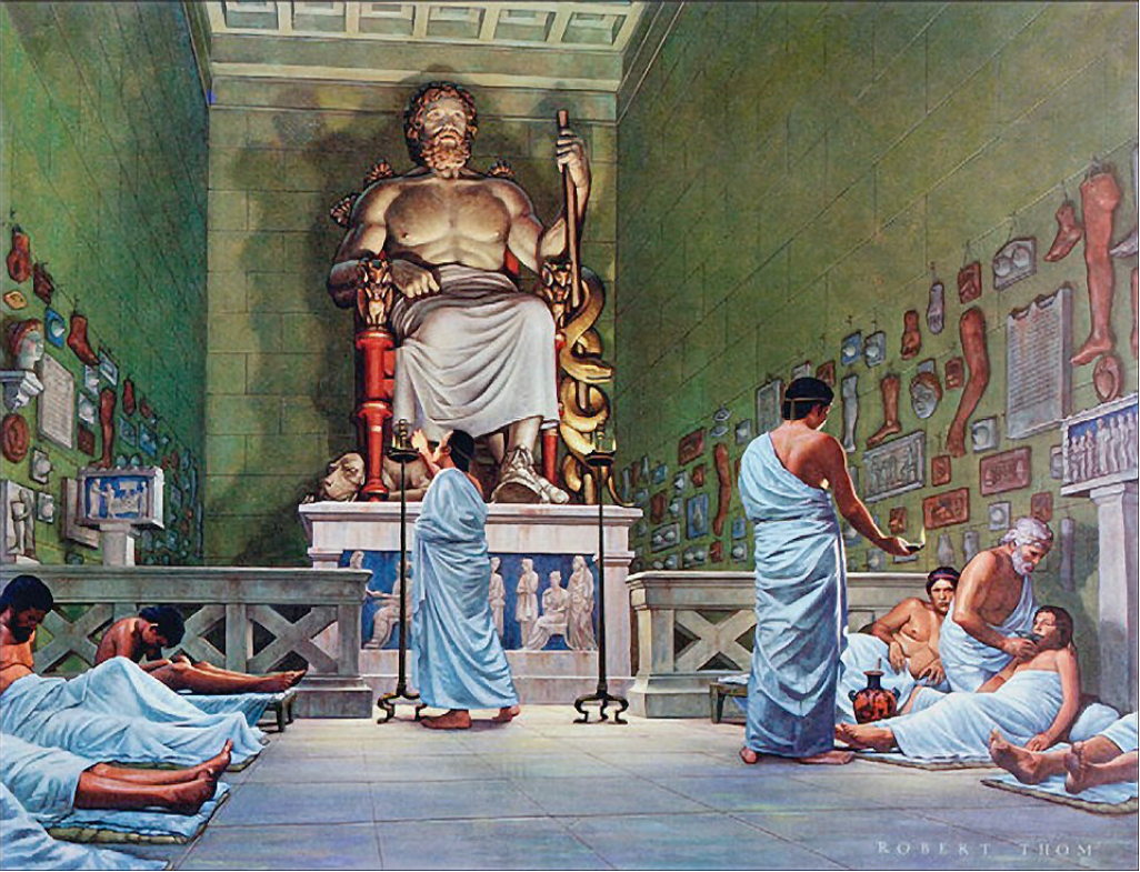 Asclépios, dieu grec de la médecine, représenté avec un serpent enroulé autour d’un bâton, fait l'objet du culte des Romains à partir du IIIe siècle av. J.-C.